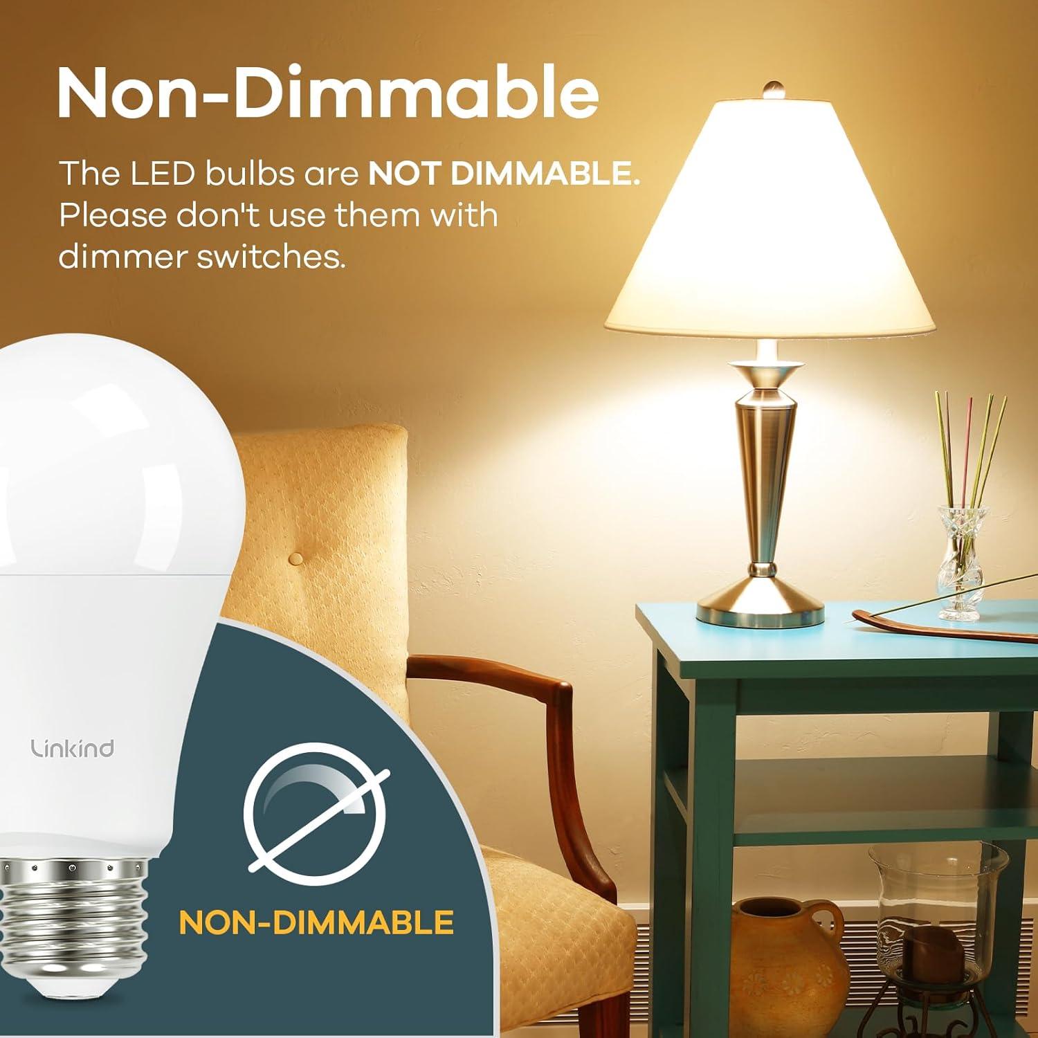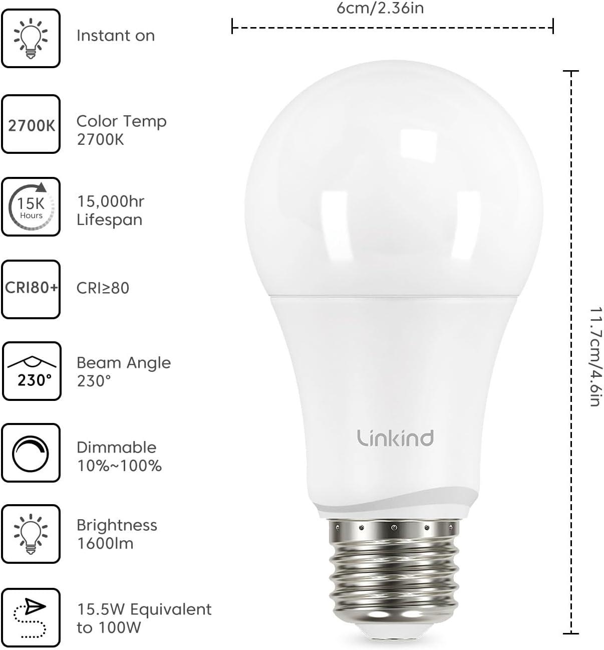 [A19 Non-Dimmable Bulbs] Linkind A19 NON-Dimmable light bulbs only consume 14W power, equivalent to 100W halogen bulbs, greatly reducing your electricity bill and saving energy. The energy-efficient light bulbs emit 1600 lumens of 2700K soft white light.