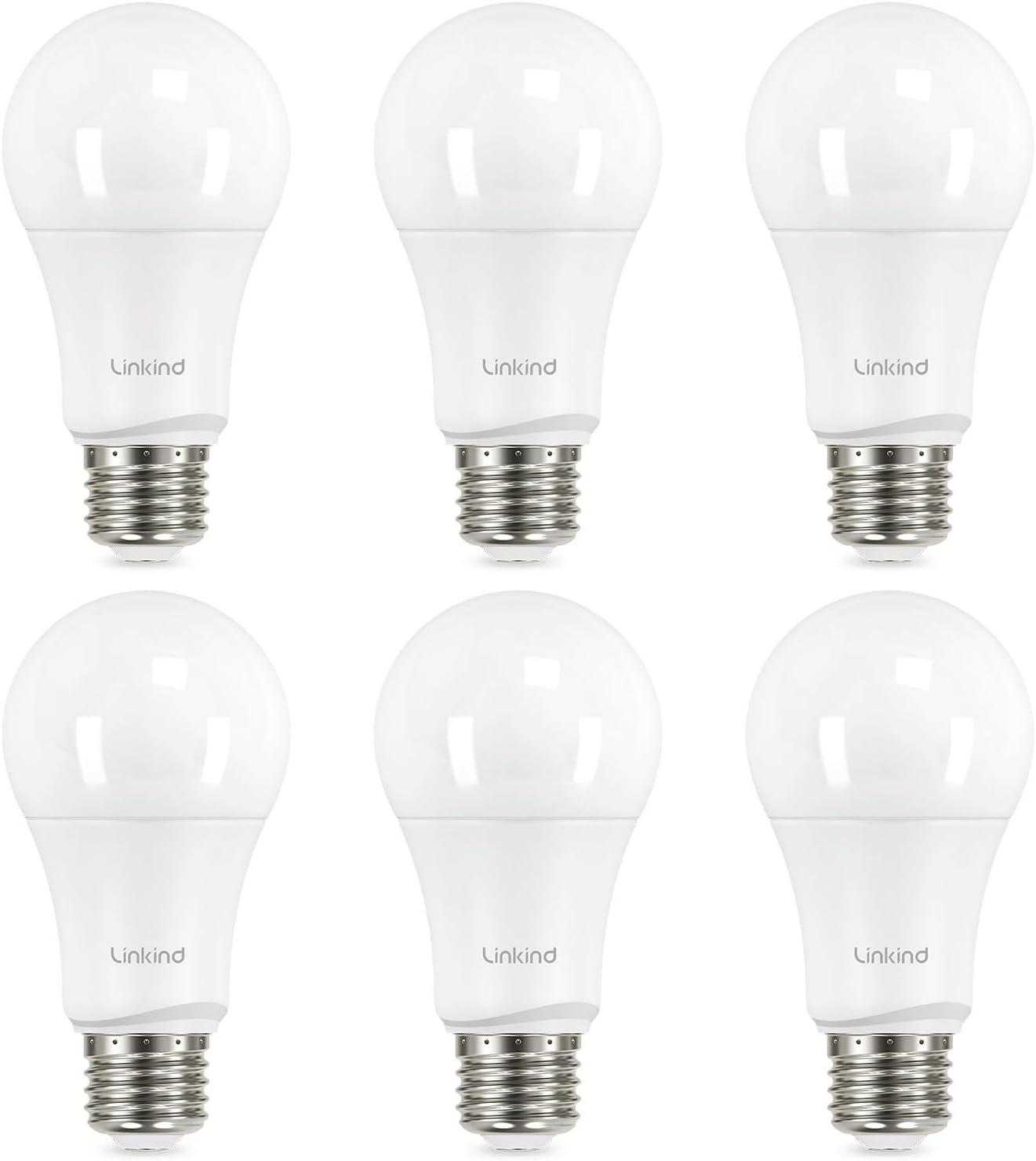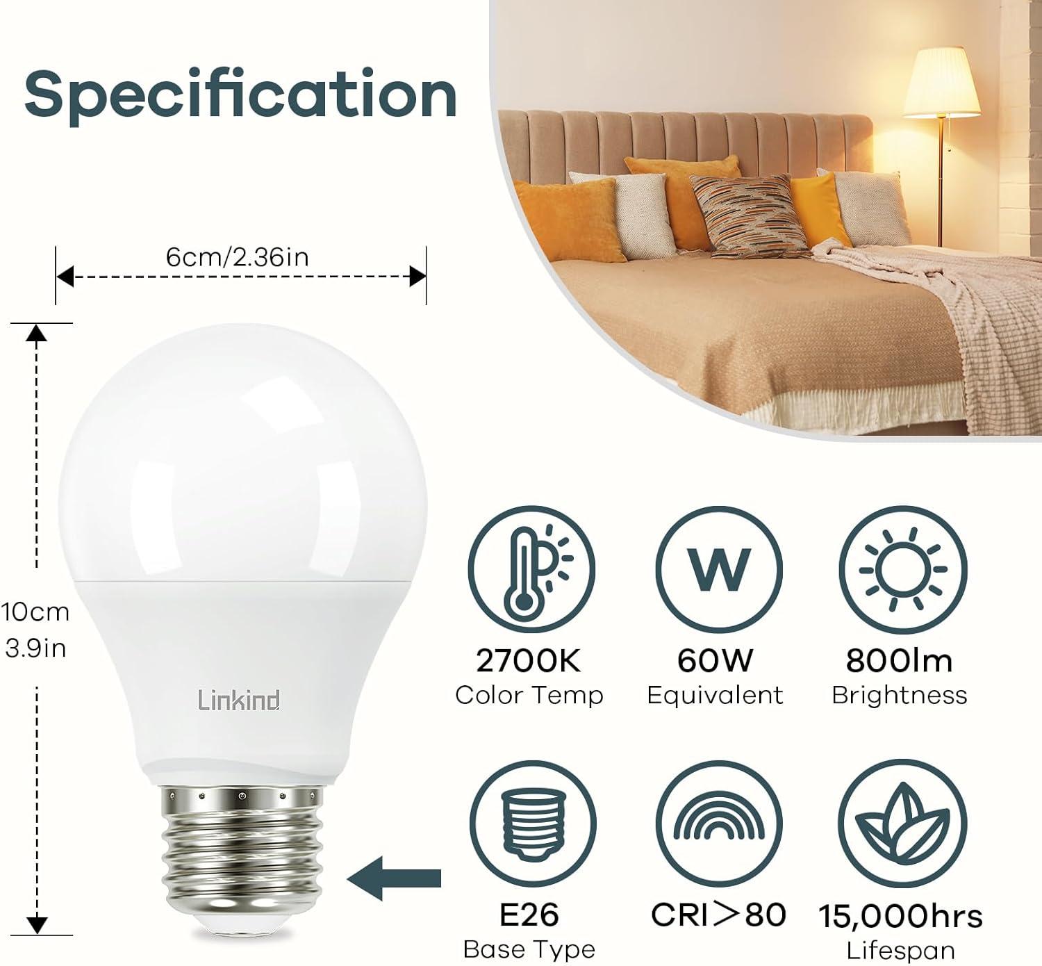 [A19 Non-Dimmable Bulbs] Linkind A19 NON-Dimmable light bulbs only consume 9W power, equivalent to 60W halogen bulbs, greatly reducing your electricity bill and saving energy. The energy-efficient light bulbs emit 800 lumens of 2700K soft white light.