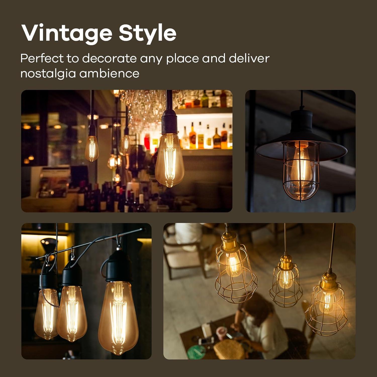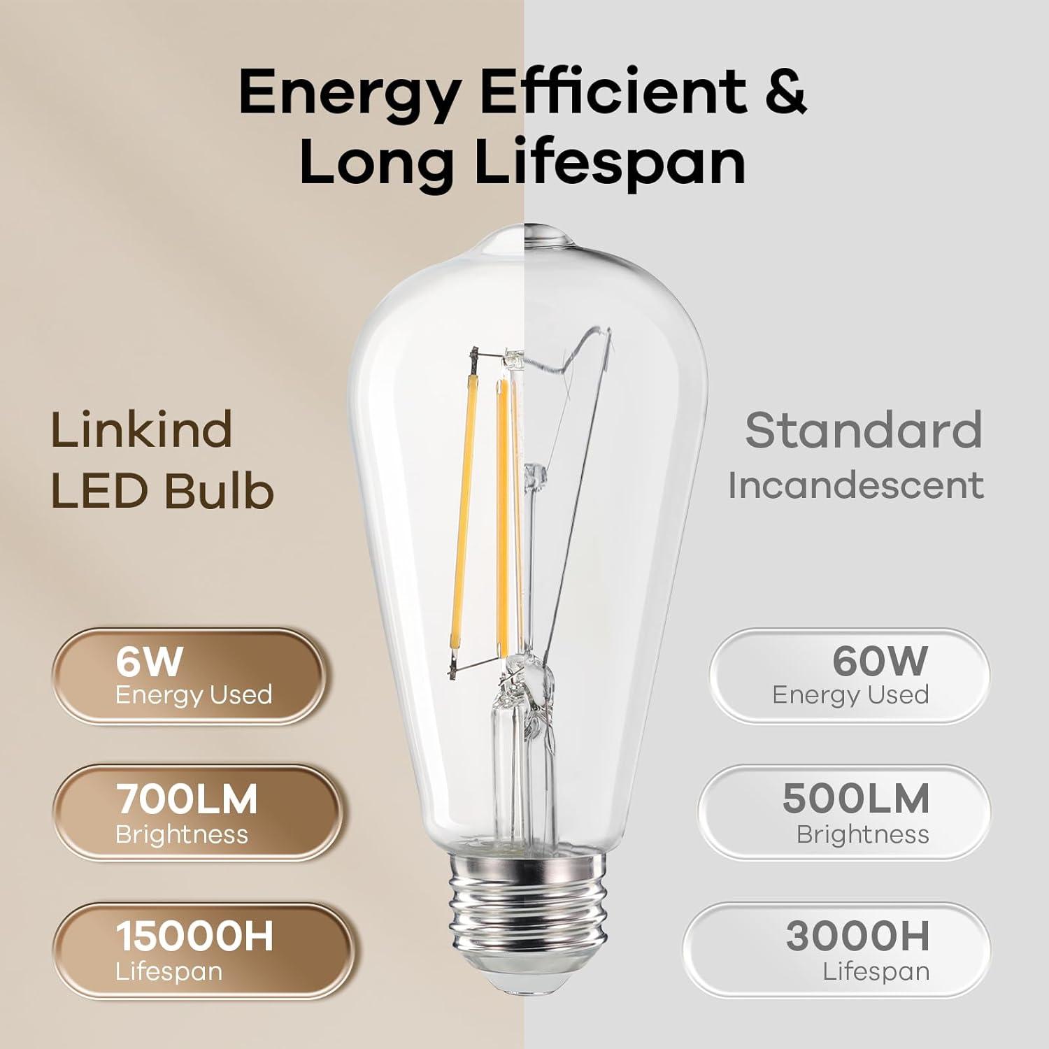 [ST58 Smooth Dimming & Flicker Free] Linkind ST58 edison dimmable led light bulbs have smooth dimming range from 10%-100% without any buzz or flickering, helping you to set any brightness you prefer. Giving off 700 lumens of light output, they are super bright to light up every dark corner and create a cosy, neat atmosphere for relaxation with 2700K soft and warm white light. (Used with Dimmer)
