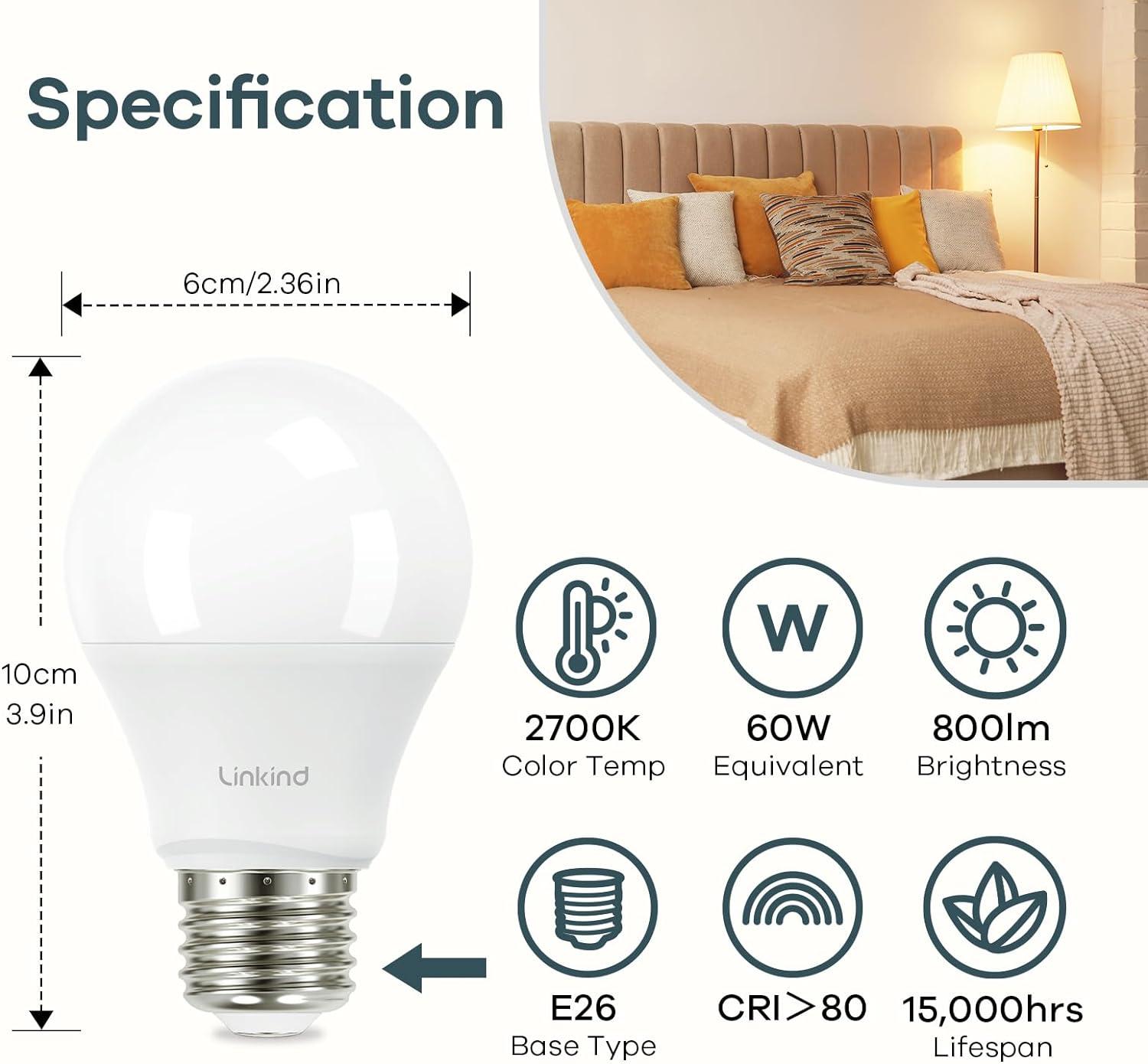 Be the first to review “Linkind A19 LED Light Bulb, 60W Equivalent, 2700K Soft White Light Bulbs, 800 Lumens 8.5W Non-Dimmable LED Bulbs, E26 Standard Base, Energy Efficient for Bedroom Home Office, 6 Packs(Soft White-60 Watt 4 Pack)”
