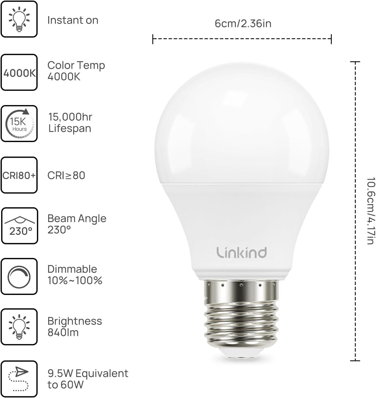 Linkind A19 LED Light Bulbs Dimmable, 40 Watt Equivalent, E26 Base, 2700K Soft White, 5W 450 Lumens CRI80+, 120V, UL Listed FCC Certified, LED Lights for Bedroom Living Room Home Office, 6 Packs(Cool White 4000k)