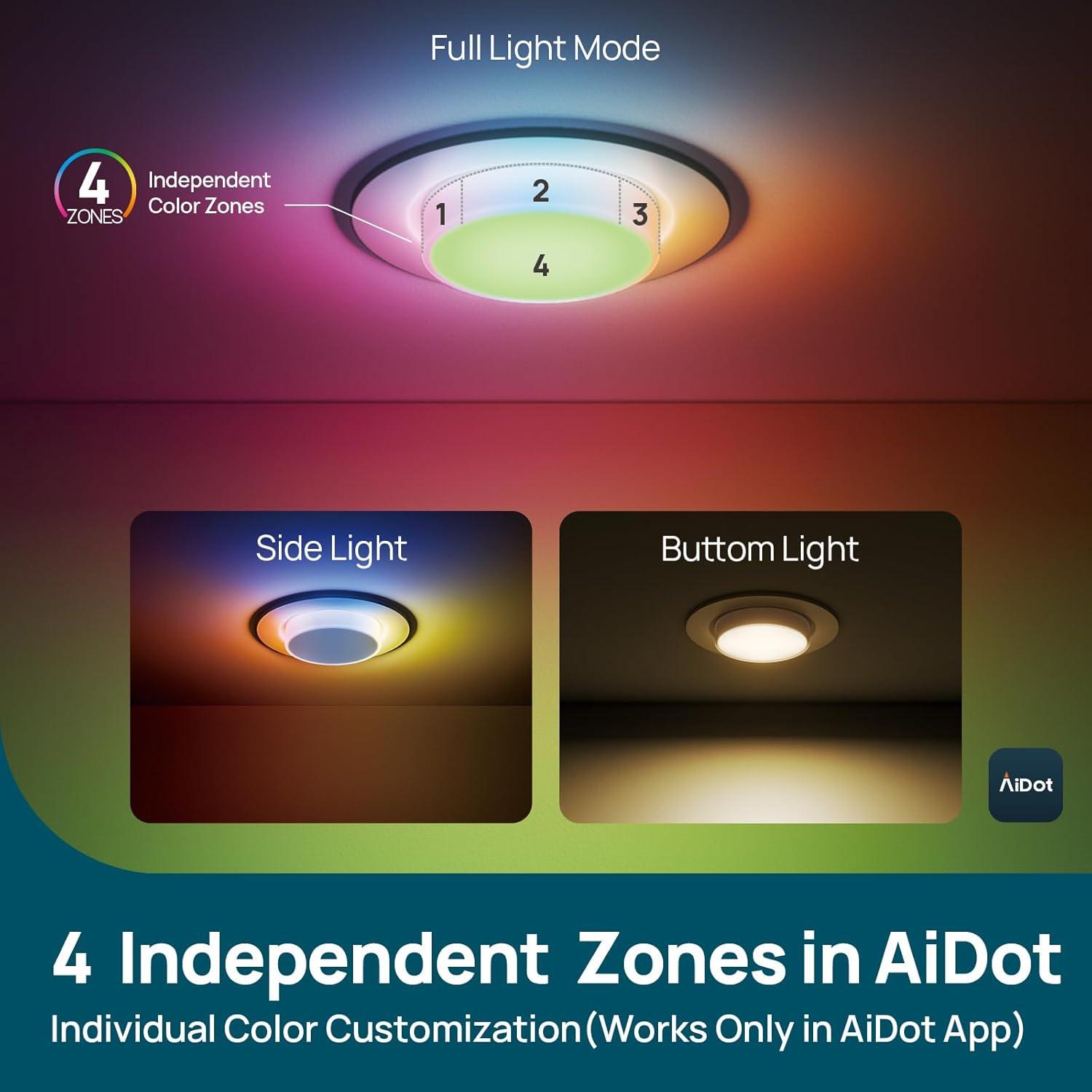 【AuraScape 4 Independent Zones】Linkind BR30 smart bulb features Aurascape technology, unlocking the ability to display up to four distinct colors simultaneously through the AiDot App, turning any ceiling into a canvas of light. With 16 million colors and tunable white light (1800K-6500K), set the perfect scene for movie nights, holiday parties, or kids’ playrooms.(Note: Individual color control for the 4 zones is only available via the AiDot App.)