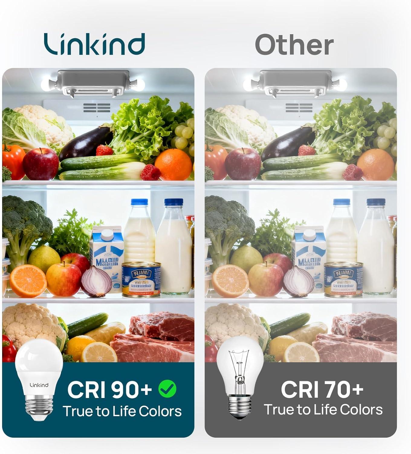 【No-heat Bulb for Referigerator】Linkind A15 refrigerator light bulbs made of IP54 waterproof materials and premium built-in LEDs, enable to work beyond -4℉-104℉(-20℃-40℃). These A15 fridge light bulbs designed for fridge lights with no heat, being fridge-friendly by reducing heat build up, helping maintain optimal cooling efficiency