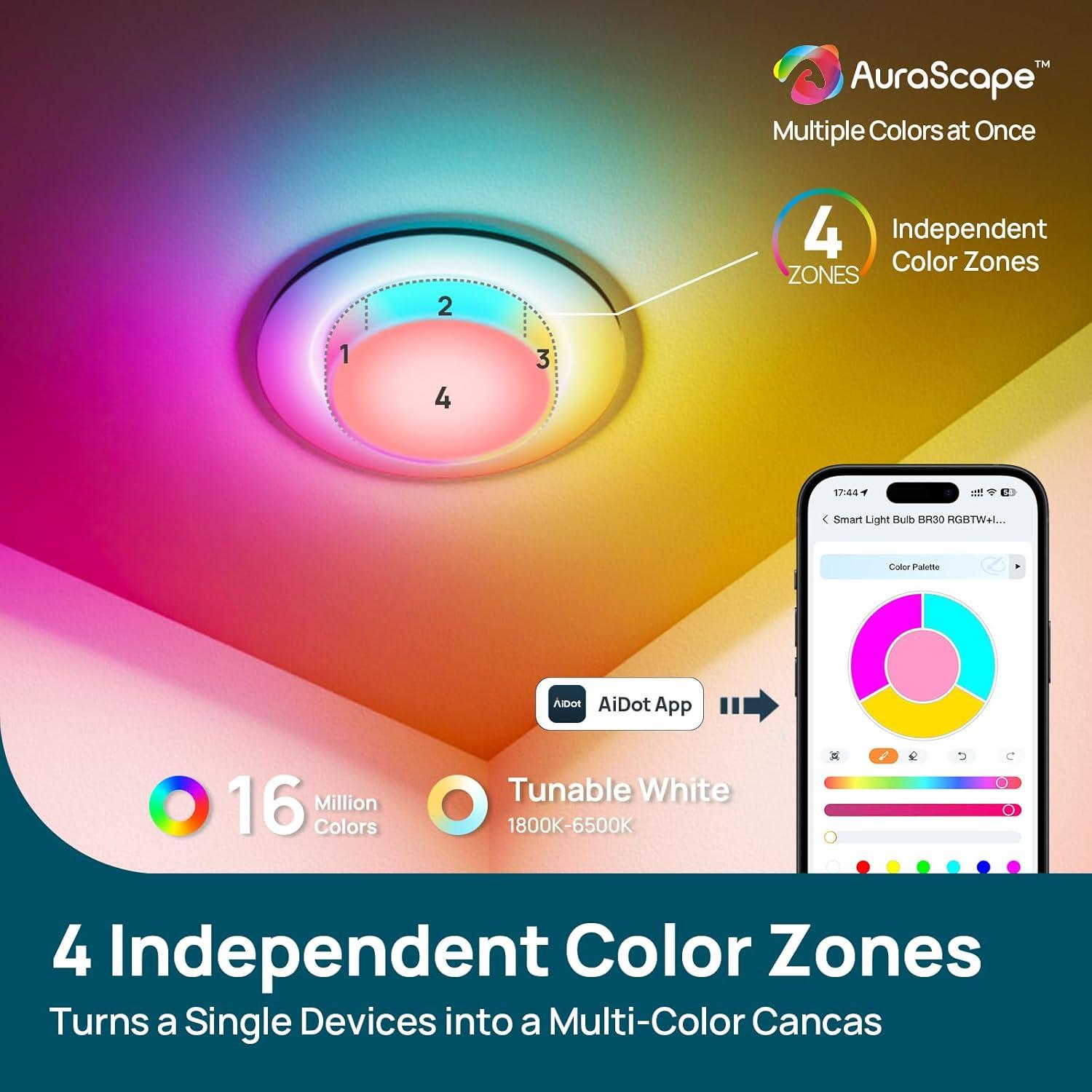 【AuraScape 4 Independent Zones】Linkind BR30 smart bulb features Aurascape technology, unlocking the ability to display up to four distinct colors simultaneously through the AiDot App, turning any ceiling into a canvas of light. With 16 million colors and tunable white light (1800K-6500K), set the perfect scene for movie nights, holiday parties, or kids’ playrooms.(Note: Individual color control for the 4 zones is only available via the AiDot App.)