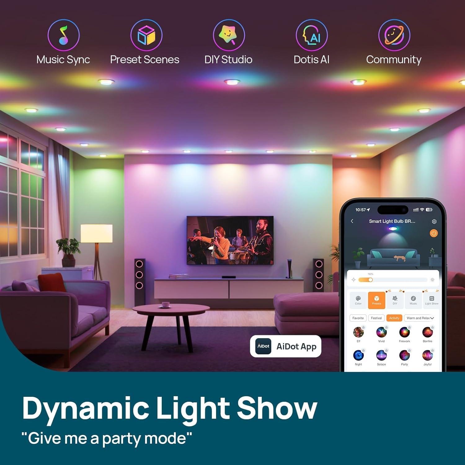 【Music Beat Sync & Preset Scenes】Make Your Lights Move with the Music. Simply download the AiDot App and grant microphone permissions. Your mobile device will then pick up the ambient sound, allowing the app to analyze the rhythm and sync your color changing light bulbs to the beat in real-time—perfect for turning any gathering into an immersive experience. Personalize further: use the AiDot App's DIY Studio to create custom scenes, or choose from instant modes like Party, Dynamic, Calm, or Auto Rhythm. Effortlessly set the perfect scene for every moment with your smart bulbs.