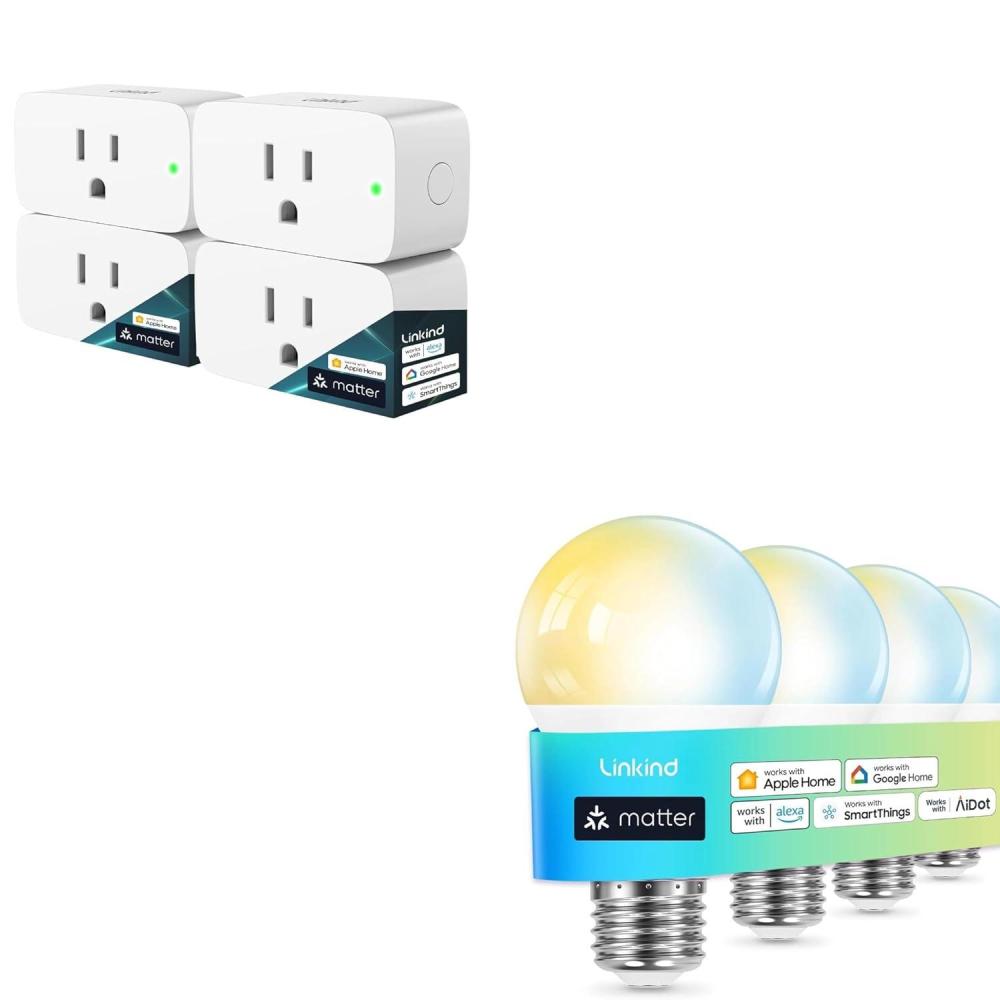 Linkind Matter Smart Light Bulb 4 Pack, Soft White to Daylight Tunable Alexa Light Bulbs, Smart Bulbs Work with Apple Home, Alexa, Google Home, bundle with Linkind Matter Smart Plug 4Pack
