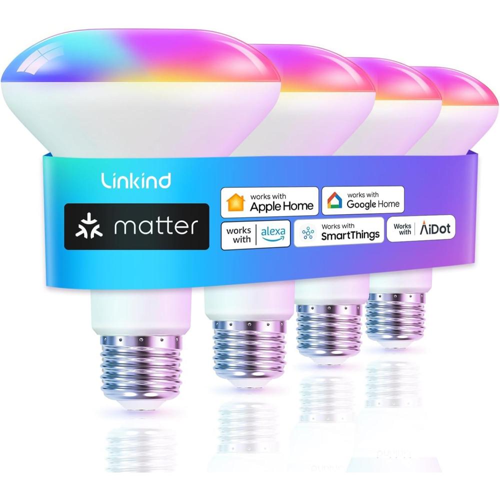 Linkind Matter Smart Light Bulb, BR30 Smart Bulbs, Recessed LED Color Changing Light Bulbs RGBTW, E26 Smart Flood Light Bulbs 650LM 60W Work with Alexa, Apple Home, Google Home, SmartThings, 4Pack(Glow Lite 650lm-4pk)
