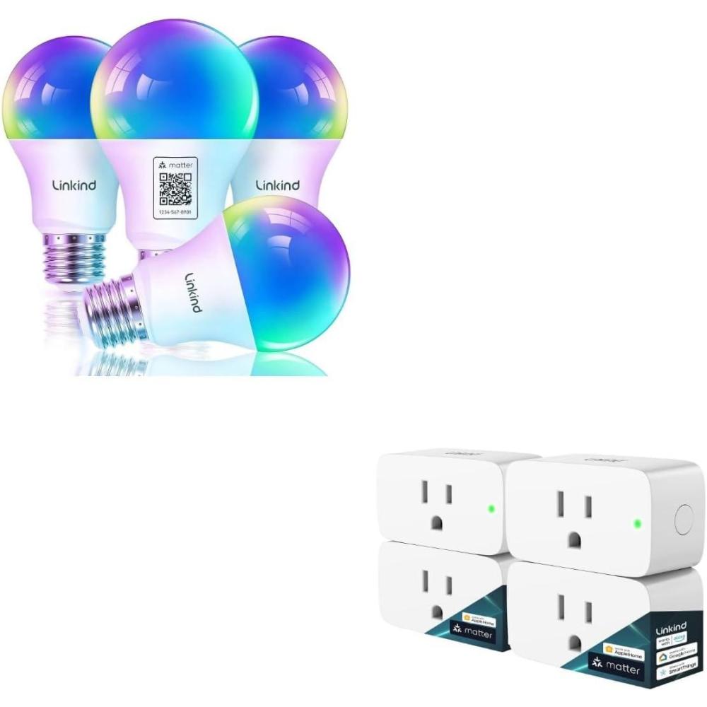 Linkind Matter Smart Plug 4 Pack Matter Smart Light Bulbs 4 Pack, Work with Apple Home/Alexa/Siri/Google Home/SmartThings