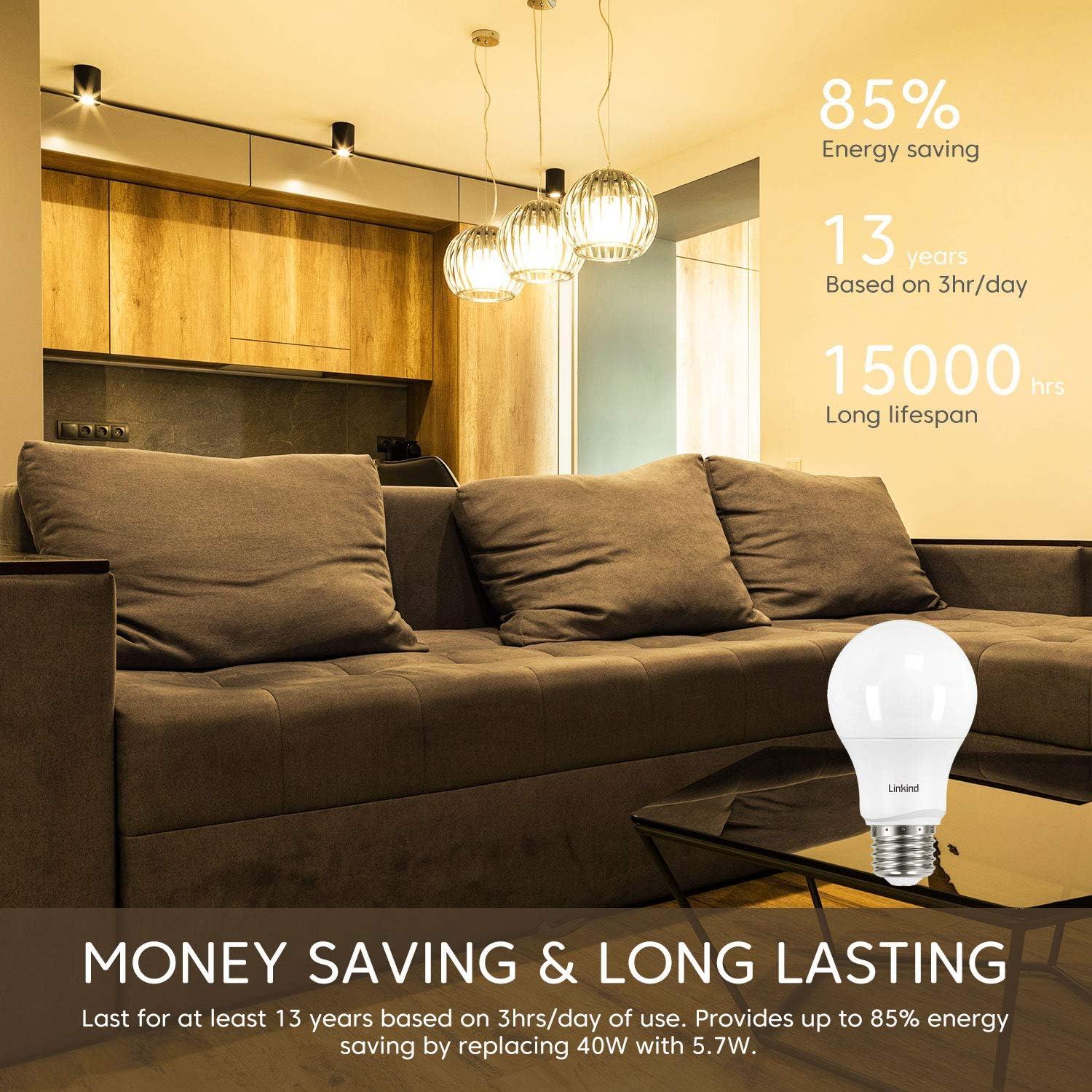 MONEY SAVING & LONG LASTING: Linkind A19 LED light bulbs can last for at least 13 years based on 3hrs/day of use. It provides up to 85% energy saving. Replace your old incandescent bulbs for a brighter and more energy friendly home.