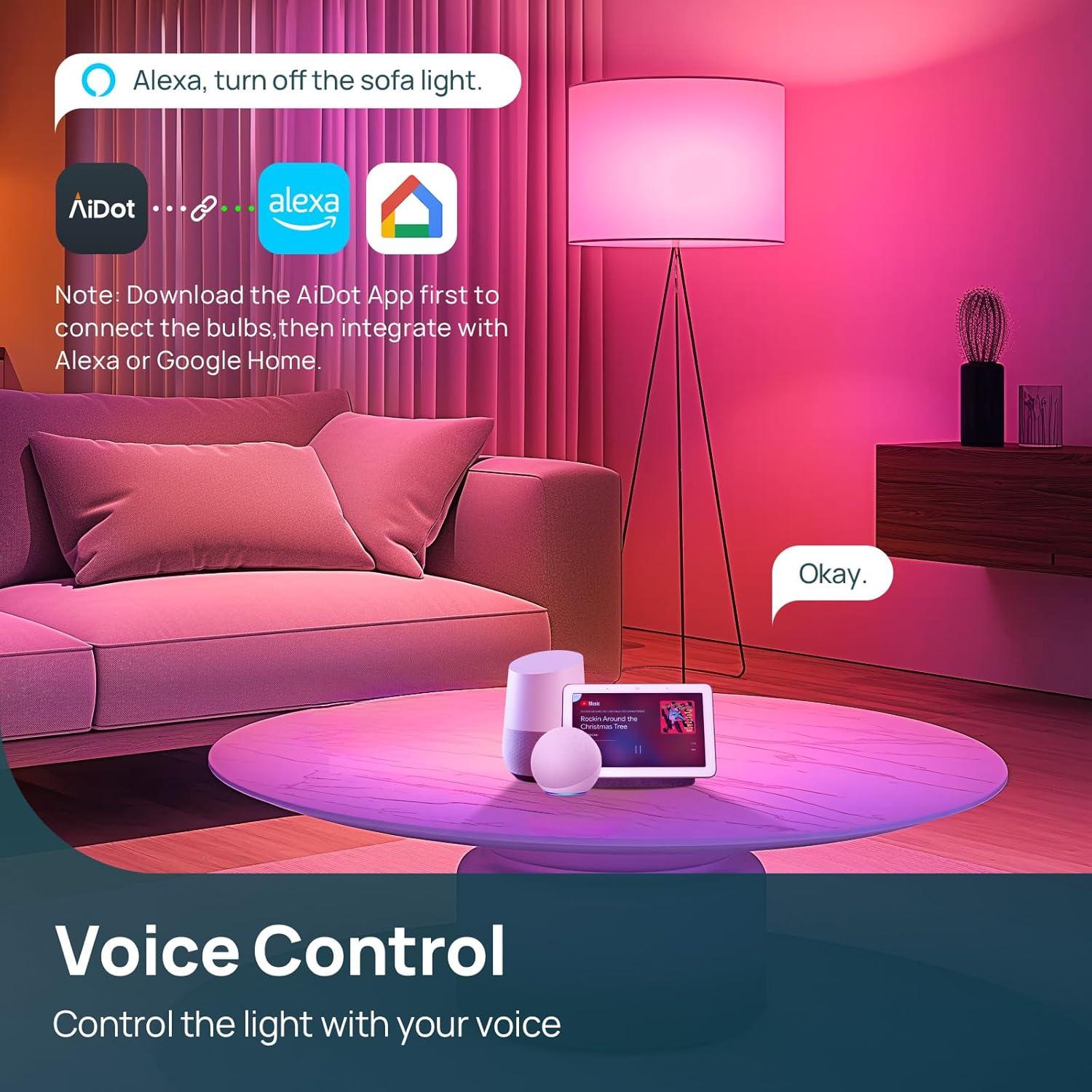 【Wi-Fi & Bluetooth Dual Connection】Wifi Bluetooth light bulbs experience faster and more reliable connectivity (2.4GHz Wi-Fi ONLY, NOT SUPPORT 5GHz) Control your lights locally via the AiDot App without a Wi-Fi connection. (INITIAL SETUP REQUIRES BOTH WI-FI AND BLUETOOTH)