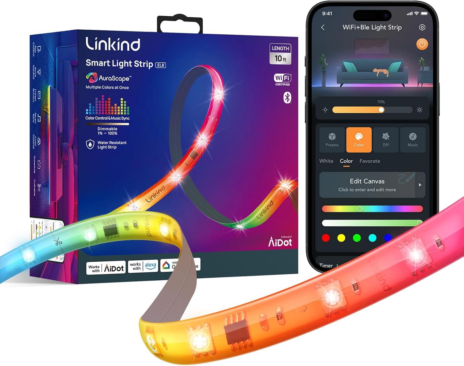 🎙️ [Multiple Smart Control Options]: Linkind LED strip lights are compatible with Alexa and Google Home, allowing you to control lighting with simple voice commands for a hands-free experience. Users can also adjust brightness, change colors, or set schedules through the AiDot app, offering a personalized and seamless smart lighting experience.