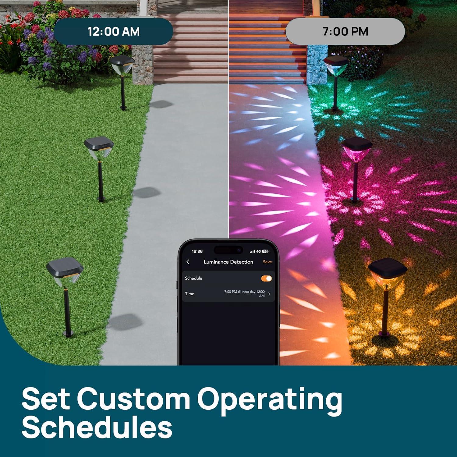 【Schedule, Automate & Group Control】Manage up to 8 groups of up to 32 lights each. Flexibly control your solar garden lights with dusk-to-dawn lighting, customized schedules via manual app control.