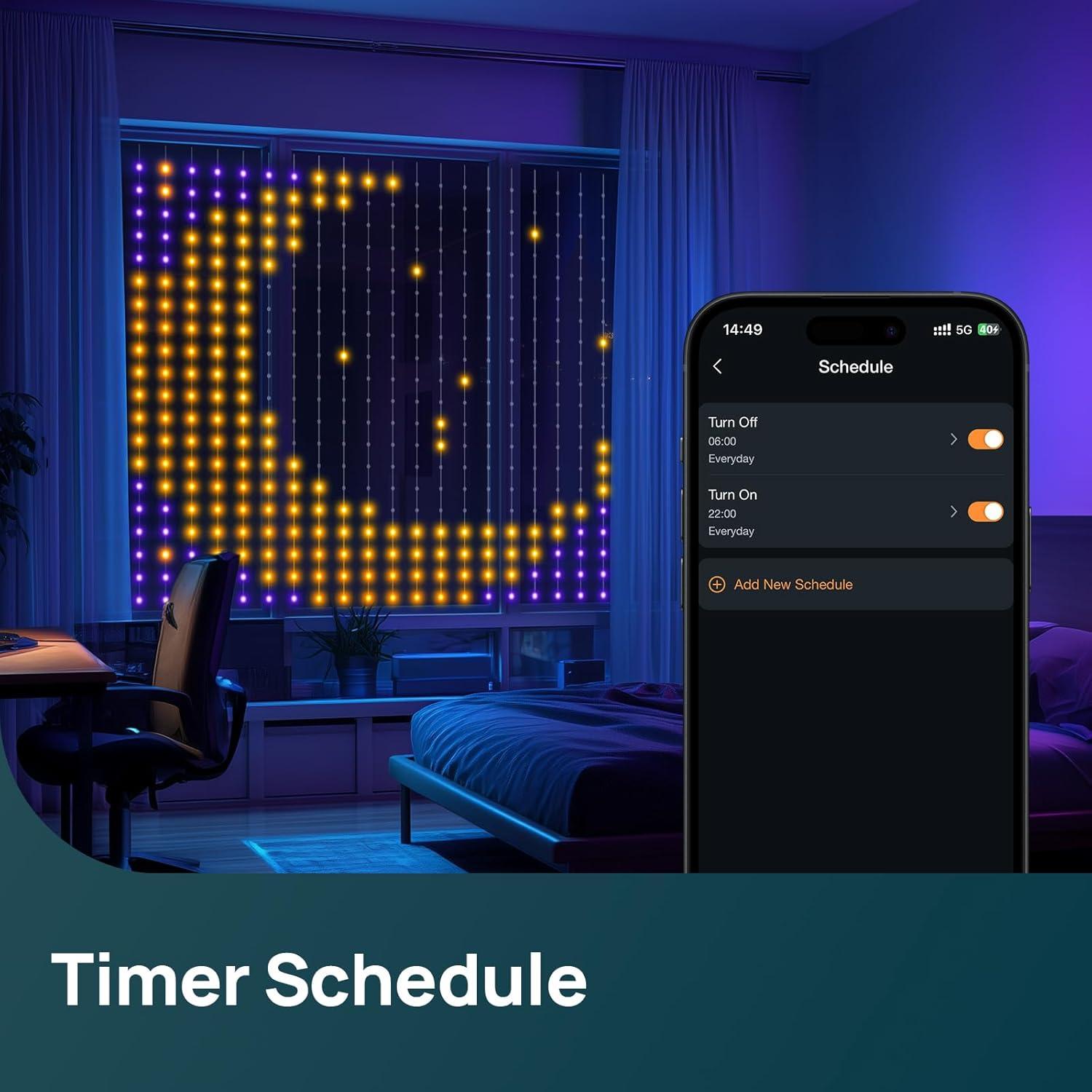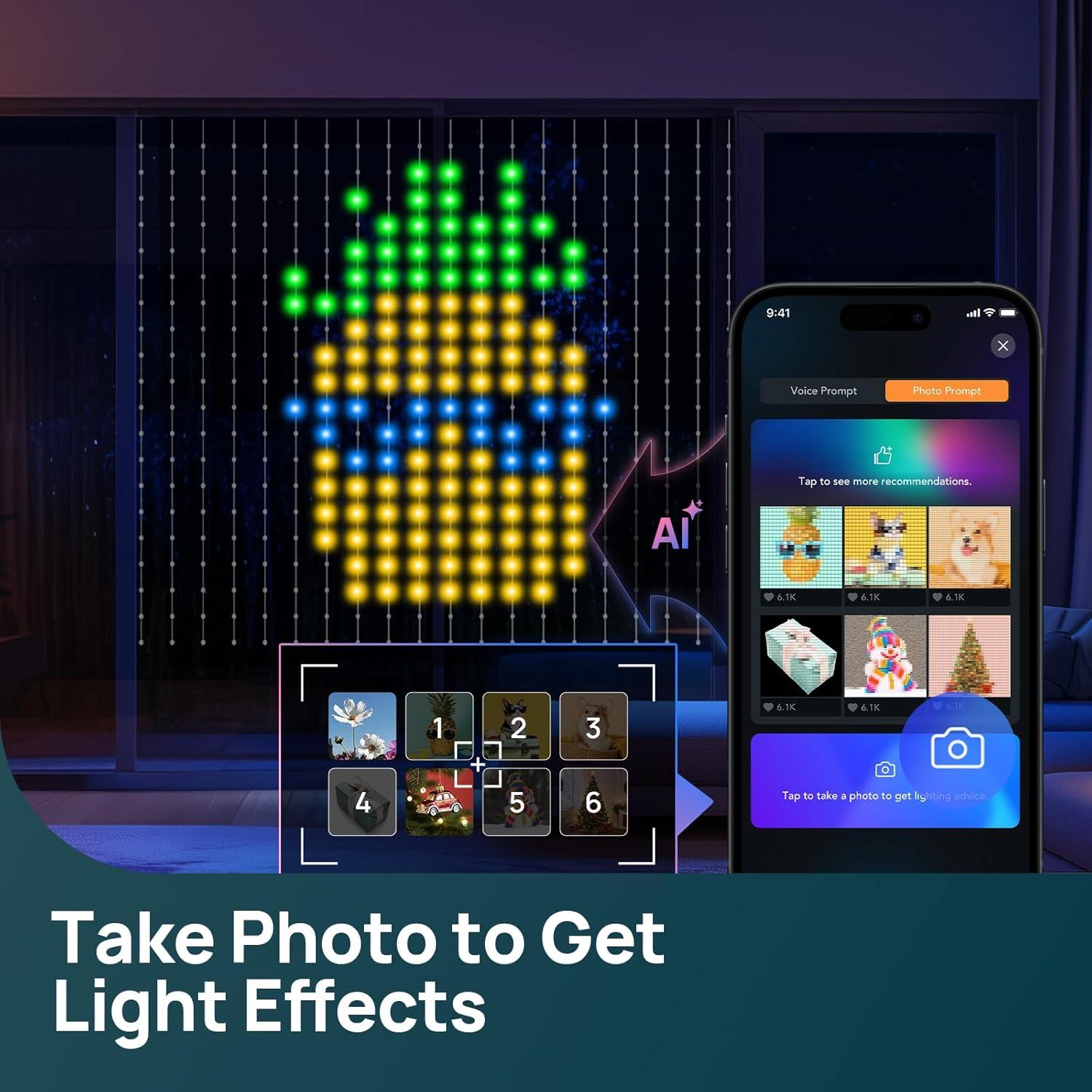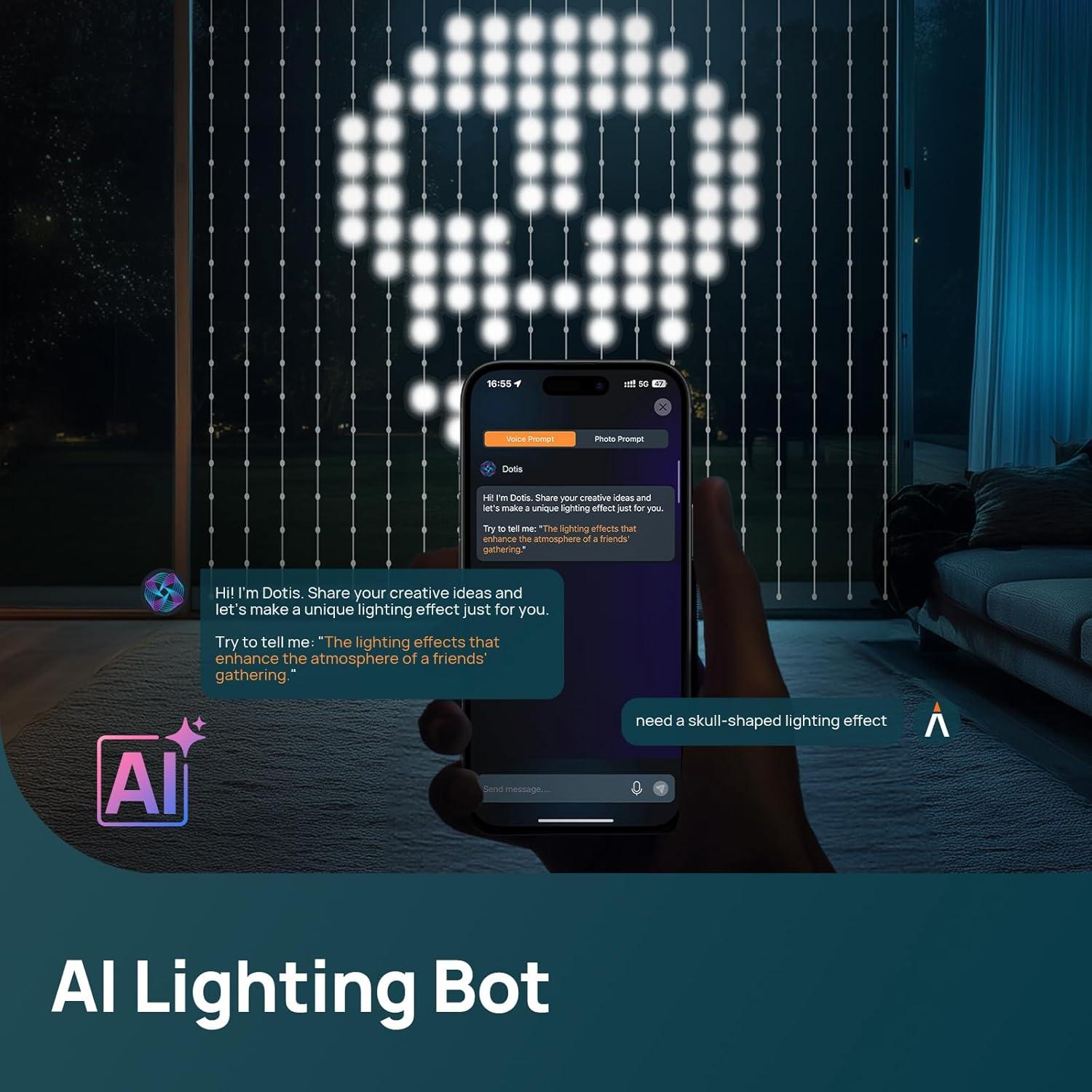 AI-Generated Lighting Effects: The smart AI automatically creates stunning light shows through the AiDot App. Simply talk to Dotis to generate personalized ambiance for your house. The AI feature can produce various lighting themes, moods, brightness levels, and smart timers tailored to your preferences.